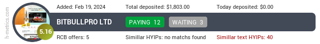 Project Name: | Bitbullpro Ltd | Registrar From: | NameSilo | Project Status: | PAYING | Launch Date: | February 19, 2024 | Added to Blog: | September 23, 2025 | Protection SSL: | Sectigo Public Server Authentication CA DV R36 valid from 13 Sep, 2025 to 14 Sep, 2026 - Sectigo Limited | Registration No: | Not Available | Hosting Provider: | Genius Guard | GoldCoders/Script: | LICENSED | Investment Plan: | 10% daily for 12 days | 17% daily for 10 days | 300% after 7 days | 450% after 5 days | Minimum Invest: | $10 | Minimum Payout : | $0.1 ePayCore, $5 TRX, $10 other cryptocurrencies | Payout Type: | Manual (up to 48 hours) | Payment Systems: | Bitcoin, Ethereum, Litecoin, Ripple, Tether, Tron, Binance Coin, Epaycore | Company Address: | UK | Our Investment: | No | Affiliate Program: | 6% - 2% - 1% | Insurance Provide: | No |
