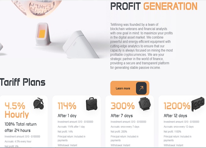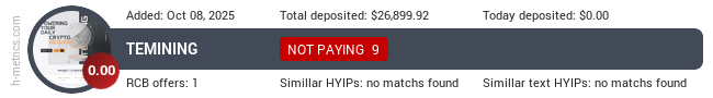 Project Name: | TEMINING | Registrar From: | Joker.com | Project Status: | SCAM | Launch Date: | October 08, 2025 | Added to Blog: | October 08, 2025 | Protection SSL: | Sectigo Public Server Authentication CA DV R36 valid from 04 Oct, 2025 to 05 Oct, 2026 - Sectigo Limited | Registration No: | Not Available | Hosting Provider: | DDOS-Guard | GoldCoders/Script: | LICENSED | Investment Plan: | 4.5% hourly for 24 Hours (108% within 1 Day); 114% after 1 Day, 300% after 7 Days, 1200% after 12 Days | Minimum Invest: | $10 | Minimum Payout : | 0.0000243 BTC, 0.0249 LTC, 11.7 DOGE, 0.00066 ETH, 0.99 XRP, 3USDT, 1.08TON, 8.79 TRX, 0.00258 BNB | Payout Type: | Instant | Payment Systems: | Bitcoin,Ethereum (ETH), Litecoin, Dogecoin, Ripple (XRP), Tron (TRX), USDT BEP-20, TON, USDT TON, USDT TRC-20, Binance Coin (BNB) | Company Address: | UK | Our Investment: | No | Affiliate Program: | 7% - 2% - 1% | Insurance Provide: | No |
